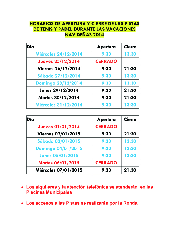 Apertura de la Instalación Tenis-Padel Navidad 2014Publicado: 22 Diciembre 2014 | Imprimir | Correo electrónico Nos comunican del Area de Deportes del Ayto. de Utebo, los días de apertura y cierre de la instalalción, durante el periodo navideño