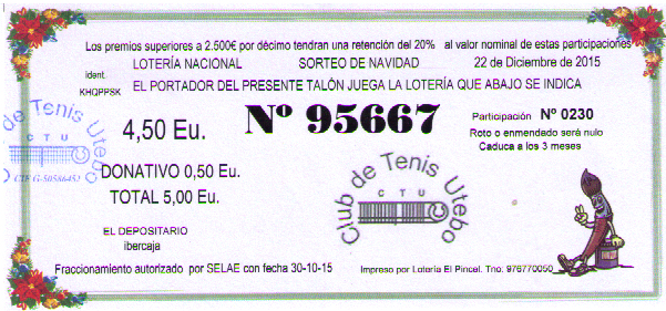 LOTERIA NAVIDAD 2015Publicado: 08 Diciembre 2015 | Imprimir | Correo electrónico LOTERIA DE NAVIDAD DEL CTU ULTIMO DÍA PARA COGER PARTICIPACIÓN LUNES 14 DE DICIEMBRE 2015
